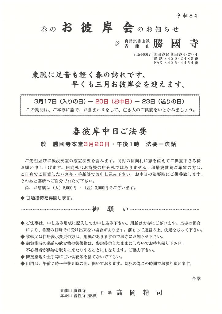 春のお彼岸が近づいてまいりました。3月17日(彼岸入り)から3月23日(彼岸明け) までの1週間がお彼岸の期間です。ご一家でご先祖様のお墓参りやお仏壇にお参りください。